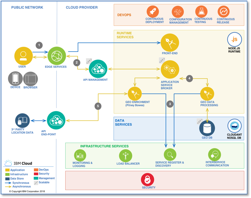 - Geo-enrichment: looking up the country and city for the GPS coordinates chosen by users. This was done by picking a 3rd party service from the IBM Cloud catalog (the Geo APIs by Pitney Bowes) and invoking them asynchronously with AJAX calls from the front-end