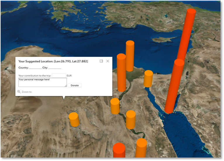 - adding a new travel location by clicking on the globe; behind the scenes recording the GPS location and packing it with the rest of the information such as the donation amount, personal message etc using GeoJSON